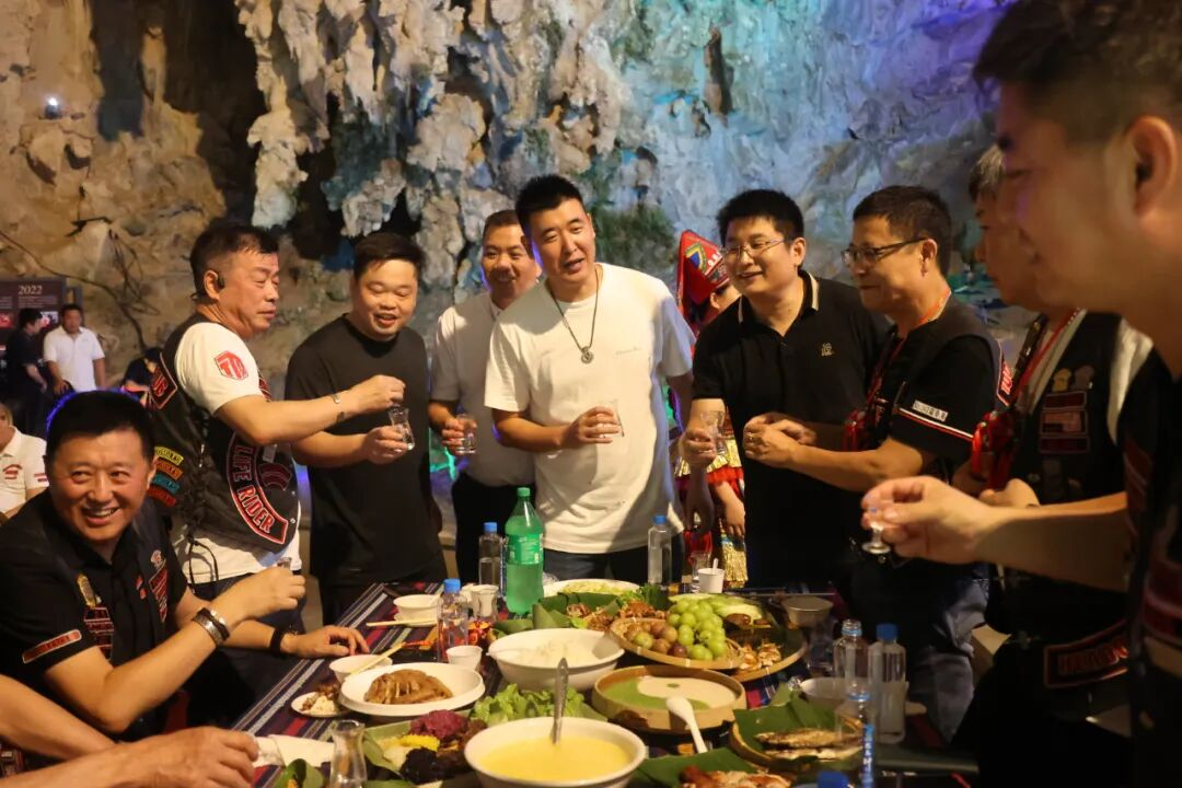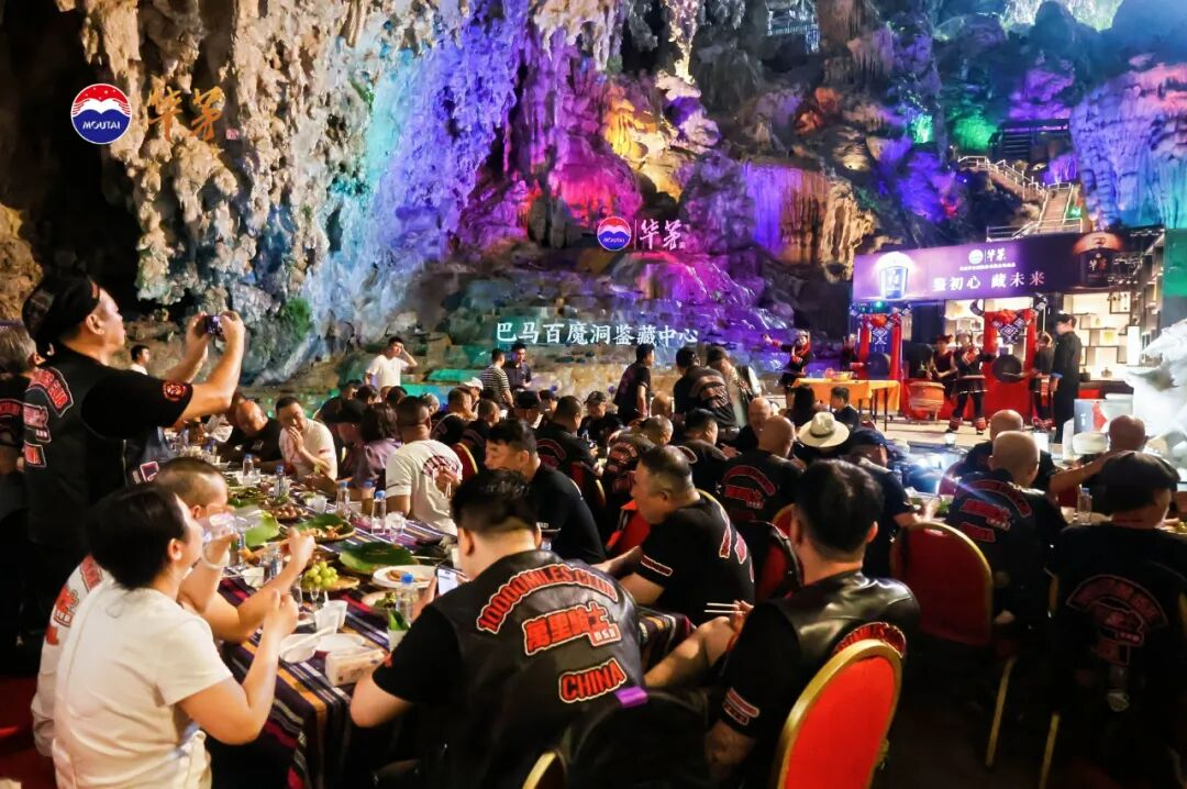 次日,骑行队伍从华昱假日酒店出发,沿盘阳河骑行至百鸟岩景区,探秘“水下洞天”的奇幻光影;午后转战百魔洞,在“磁疗圣地”中体验自然疗愈,伴以养生茶歇与簸箕宴烤全羊,将运动与养生完美结合。夜幕降临,“华茅之夜”在百魔洞前点燃,骑士们举杯共庆,将不老精神与巴马的长寿祝福融于酒香。